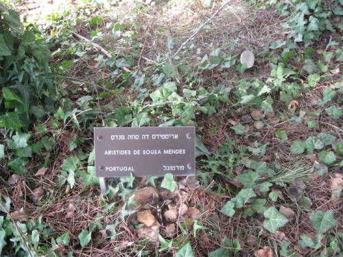 Na Av. dos Justos das Nações, junto a um pinheiro o nome de Portugal, representado por Aristides de Sousa Mendes, diplomata português que salvou a vida a muitos judeus sujeito como tantos outros justos conhecidos e anónimos às consequências de então.
