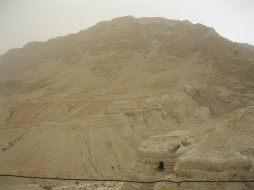 No morro em frente vê-se a janela aberta da caverna onde foram encontrados dentro de jarros de barro os papiros que hoje estão guardados a sete chaves no Santuário do Livro, em Jerusalém.